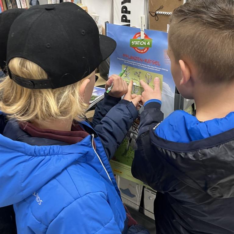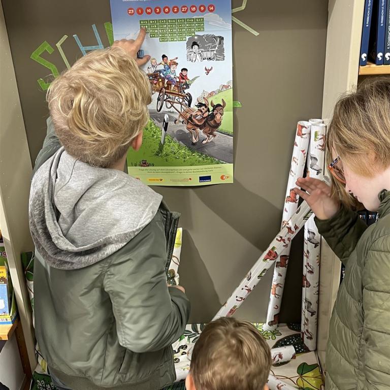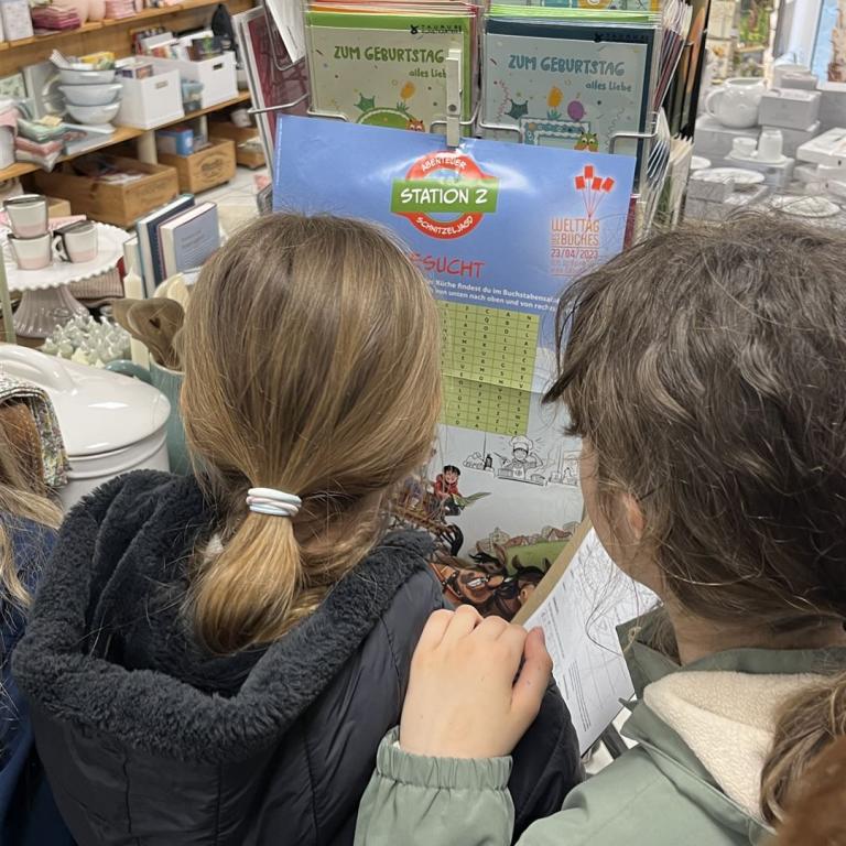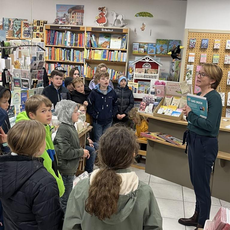 Zuvor erzählte uns Frau Mayer einige interessante Dinge über Bücher und Autoren. Anschließend gab es noch eine kleine Rallye durch den Buchladen, bei der zum Teil knifflige Fragen beantwortet werden mussten. Frau Päsold und Frau Mayer begleiteten geduldig und routiniert unsere Viertklässler durchs Quiz und belohnten sie anschließend mit ihrem tollen Buchgeschenk. Vielen herzlichen Dank für die Einladung in den Buchladen und die Einblicke in die spannende Welt der Bücher!