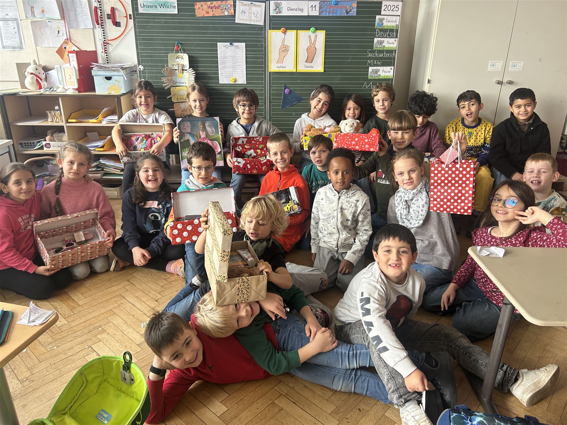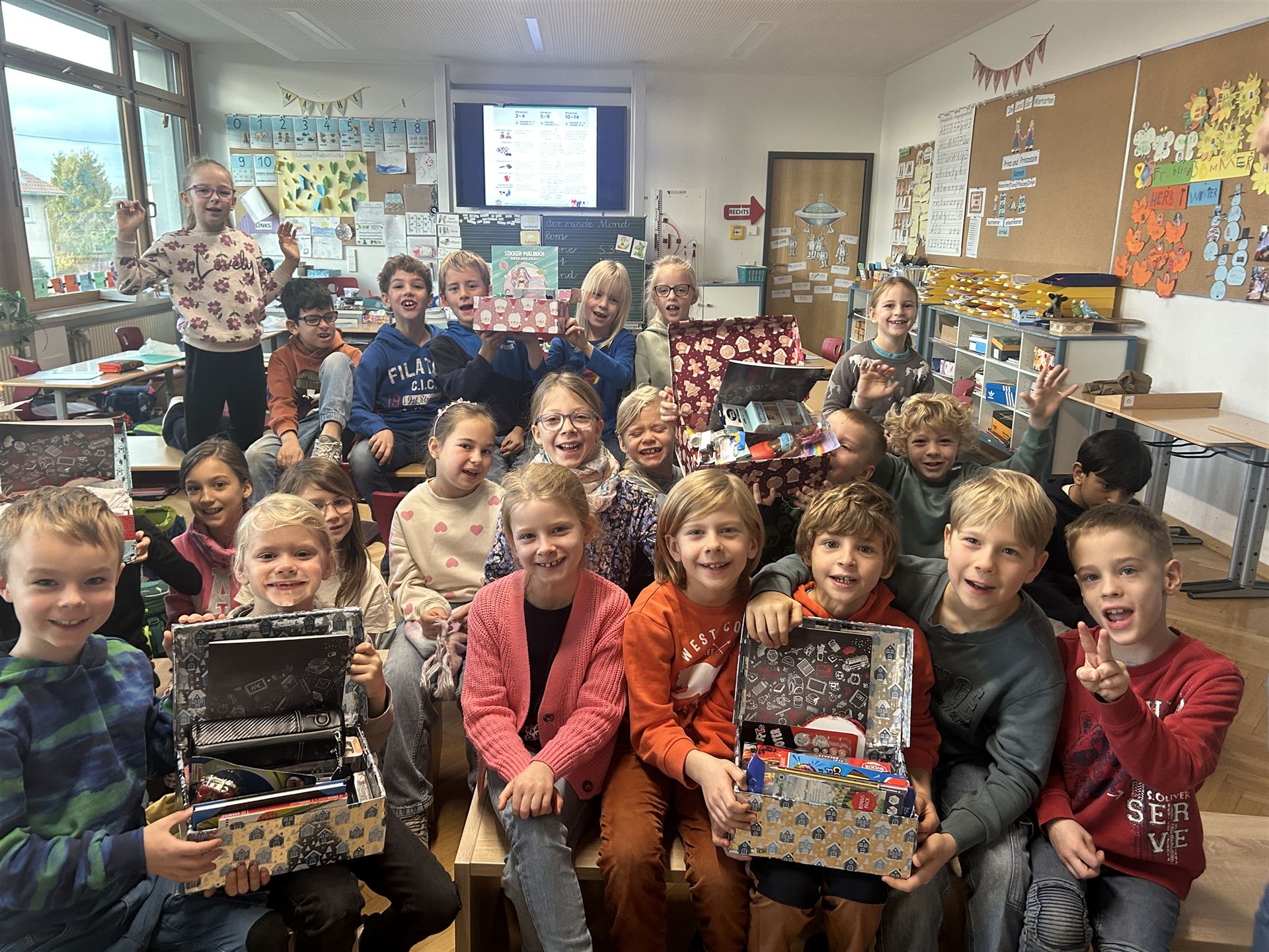 Mit viel Engagement, Begeisterung und Herz packten die Schülerinnen und Schüler beider Klassen insgesamt 13 liebevoll gefüllte Schuhkartons, die sich nun auf den Weg machen, um Kindern zu Weihnachten ein Lächeln zu schenken.