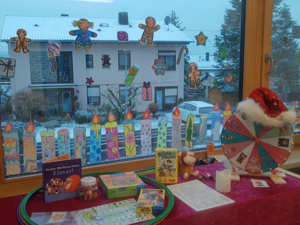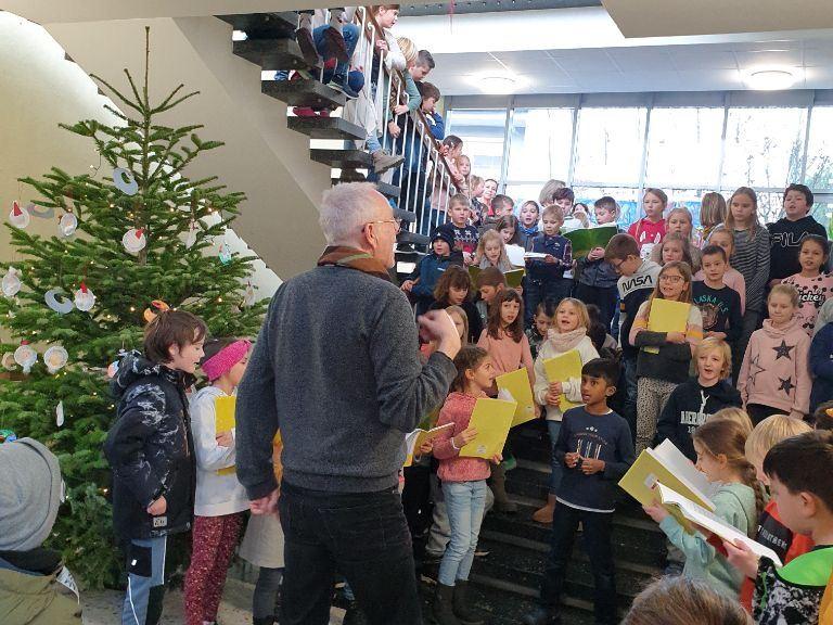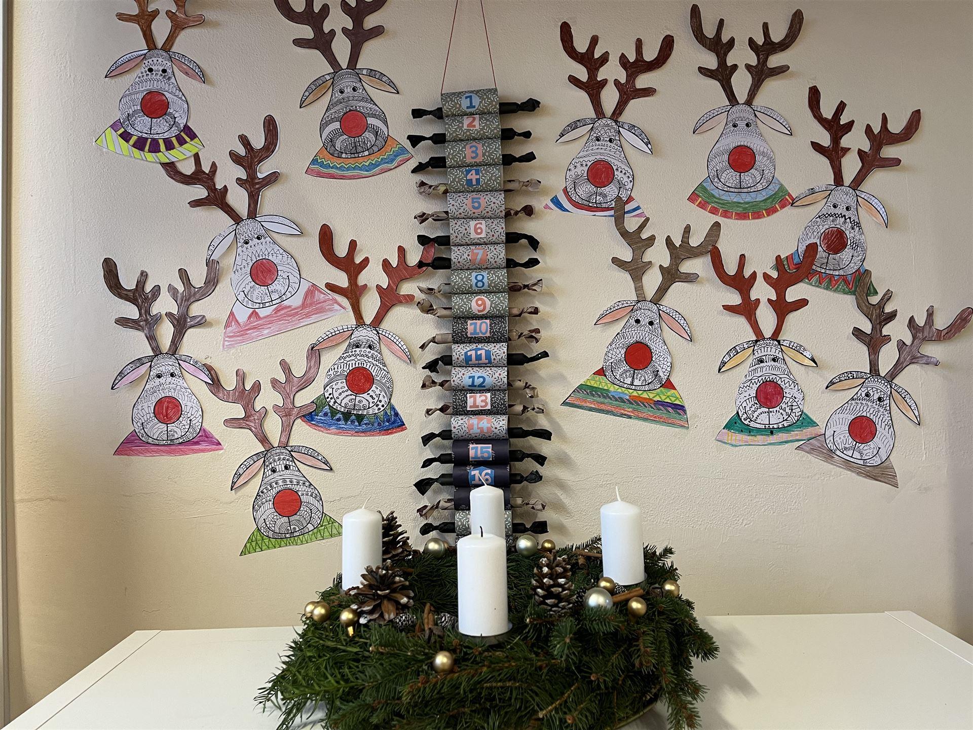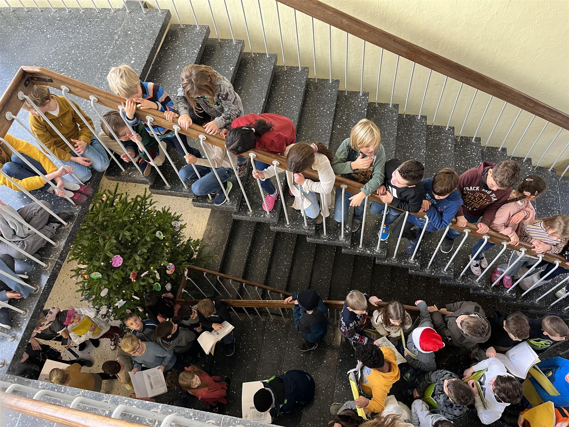 Jeden Montag im Advent hat eine Jahrgangsstufe die jeweils anderen im Eingangsbereich vor dem bunt geschmückten Tannenbaum mit Liedern beglückt. Im Schulhaus hat sich so eine schöne weihnachtliche Stimmung verbreitet, die man auch in den Klassenzimmern sehen konnte. Überall bunt geschmückte Fenster, Adventskränze und - kalender.