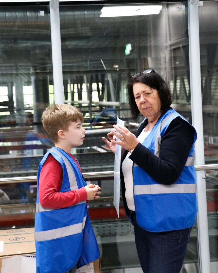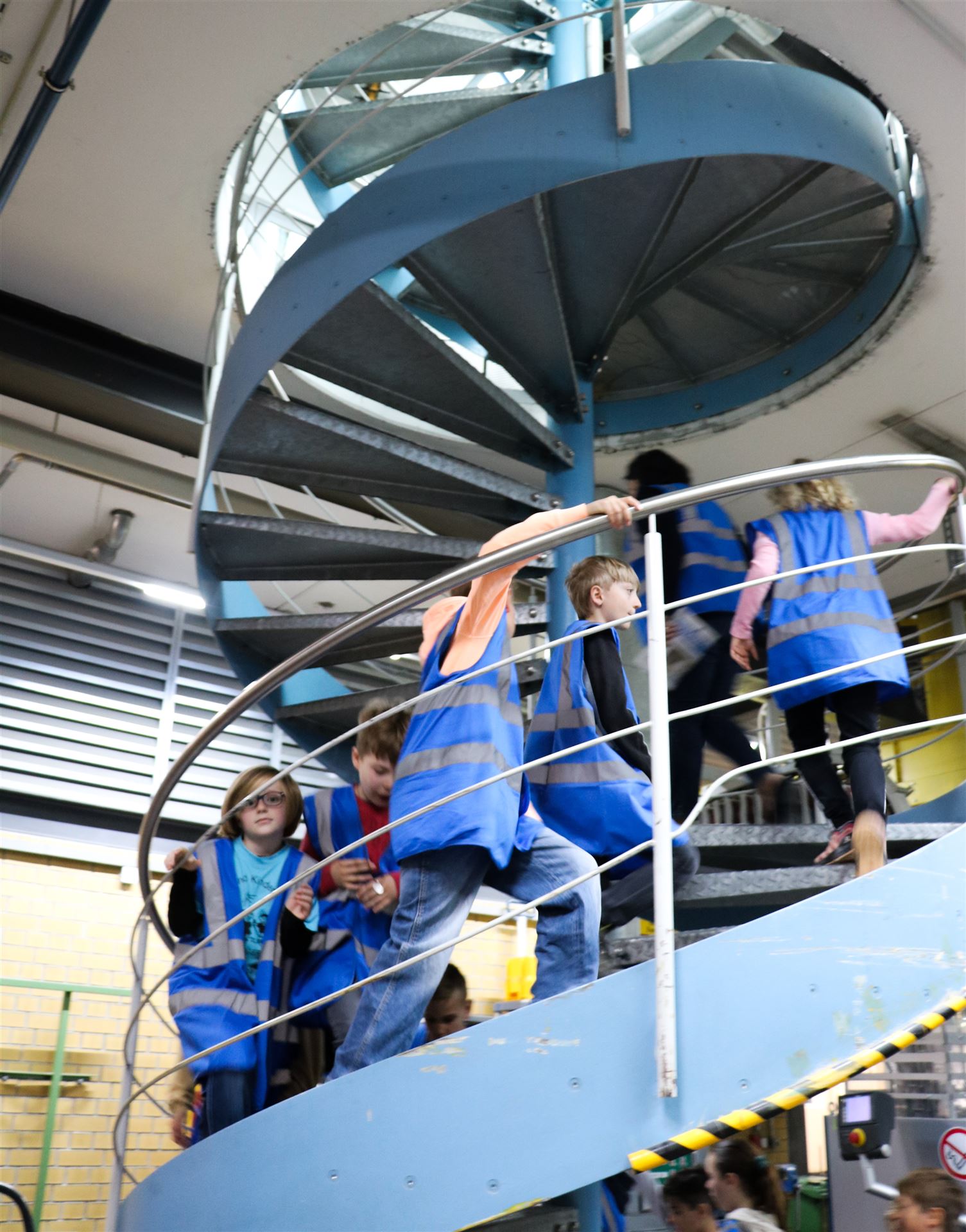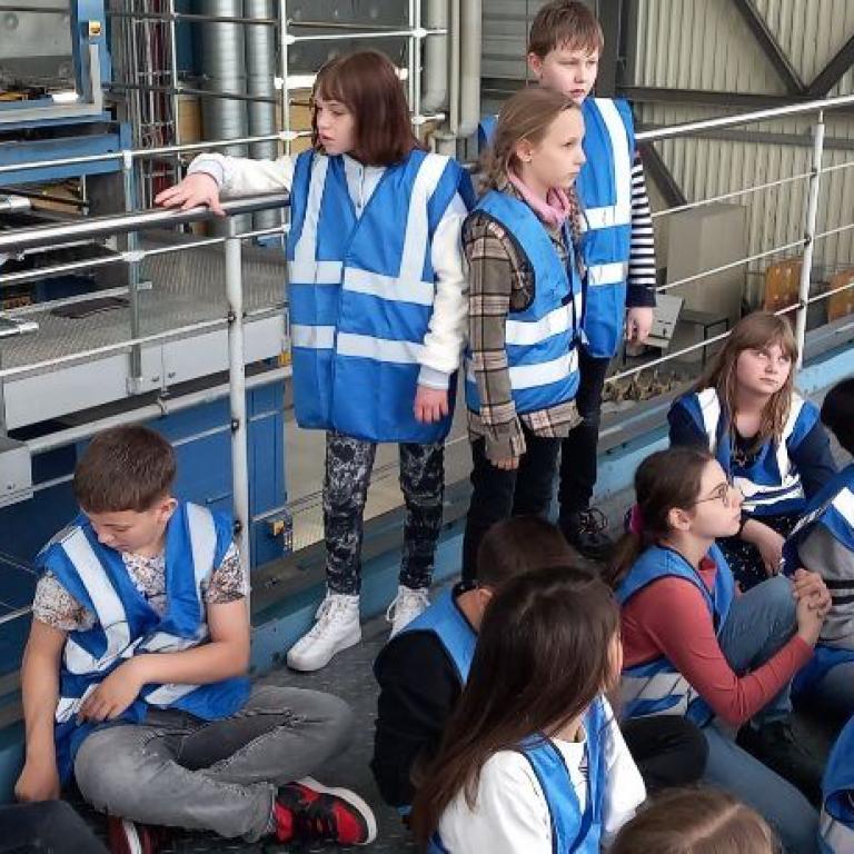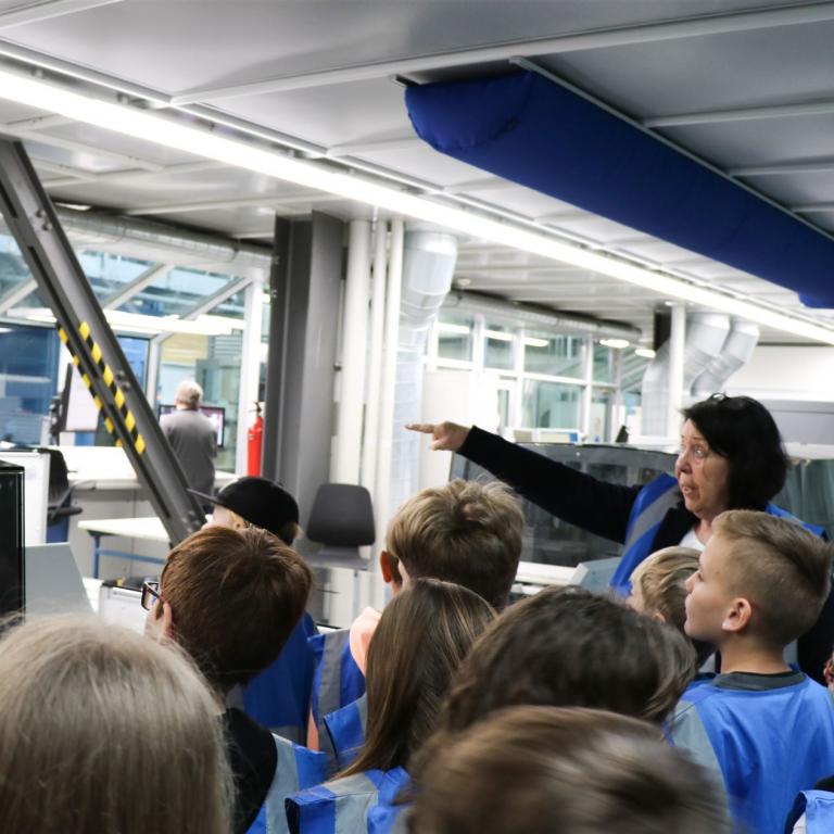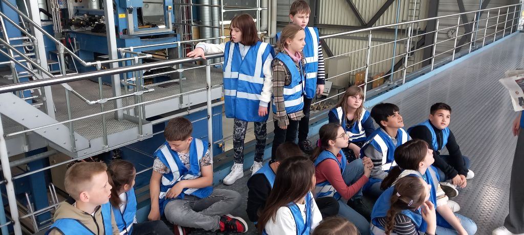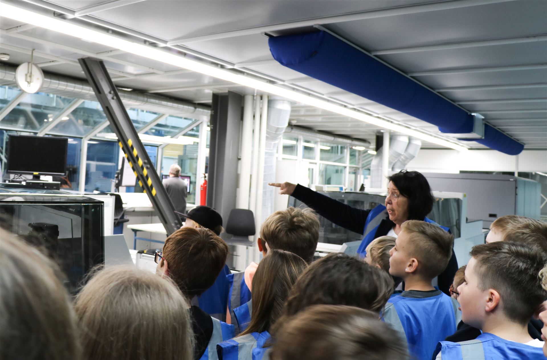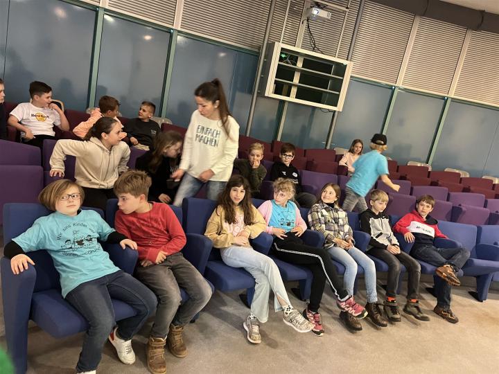 Danach gingen wir rein und verstauten unsere Sachen. Als alle fertig waren, sollten wir in den Kinoraum gehen. Dort guckten wir einen Film an, in dem alles kurz erklärt wurde. Mit uns war auch noch eine vierte Klasse aus Lauffen da. Nach dem Film zogen wir blaue Warnwesten an und dann begann die Führung. Die Westen waren dazu da, Spione zu erkennen, denn wer keine hatte, wurde als einer bezeichnet.