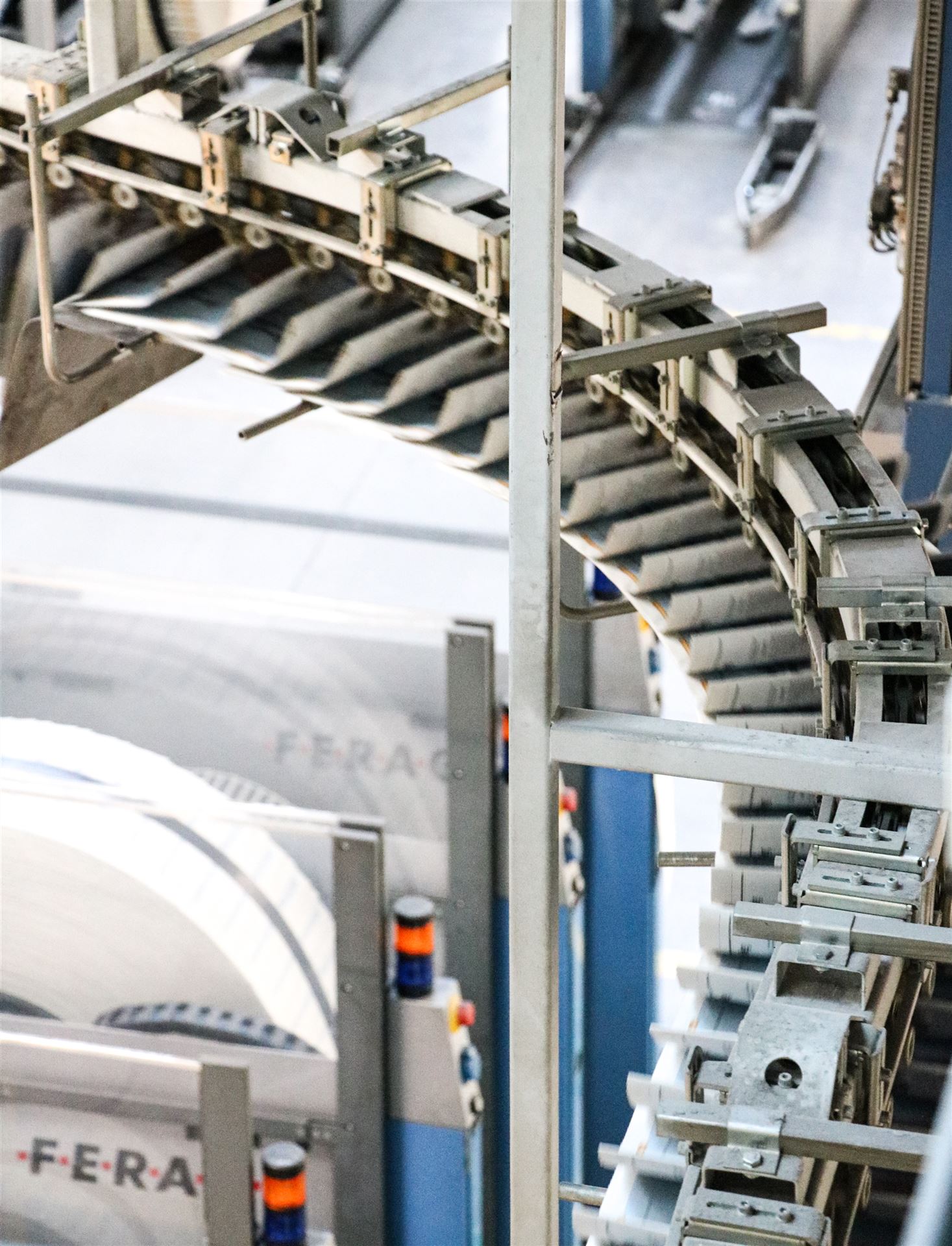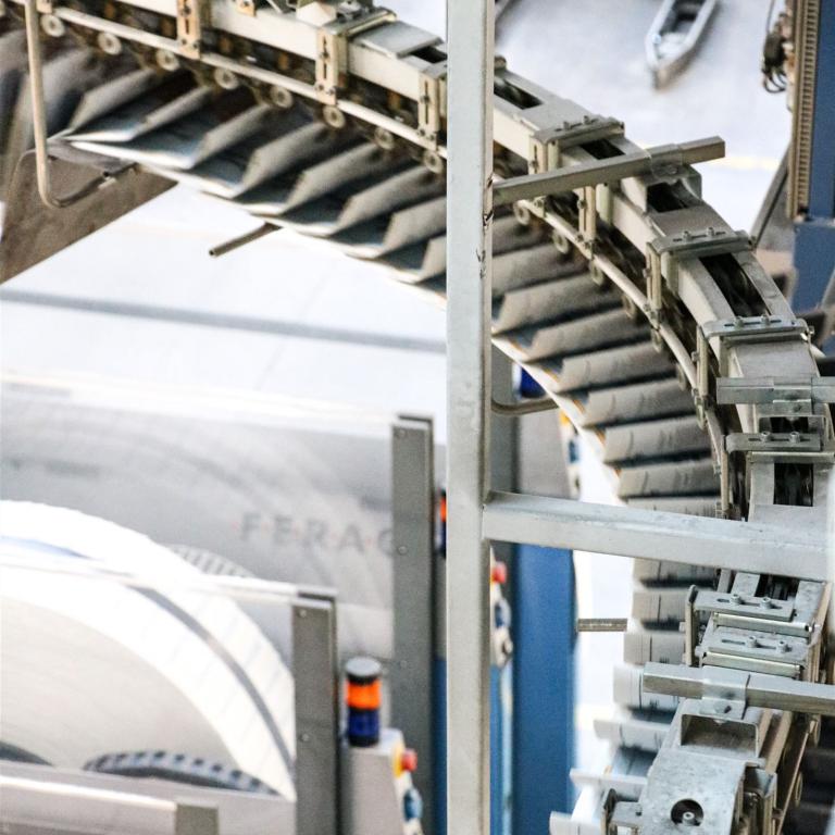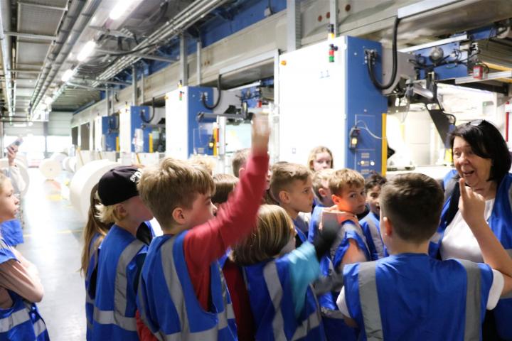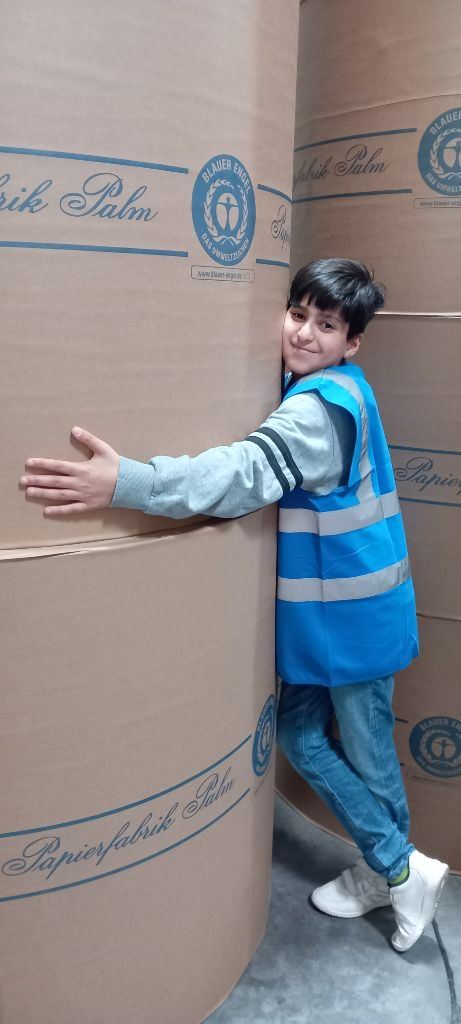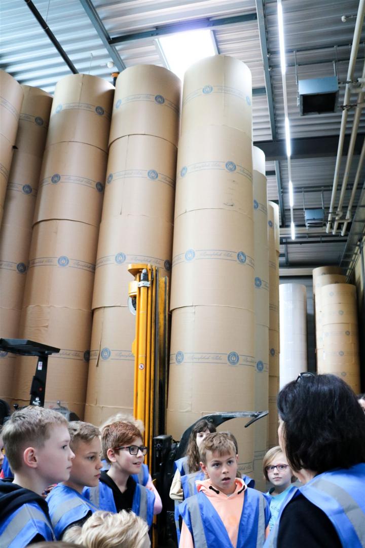 Unsere erste Station waren die Papierrollen. Es gab kleinere und größere. Die Größeren waren 1,40m hoch/groß. Bei den Kleineren wurden 6 aufeinander gestapelt, bei den Größeren nur 5. Alle 5 großen Rollen übereinander gestapelt sind 7m hoch. Am Tag werden 8 Rollen verbraucht. Hoch und runter gesetzt werden sie mit einem speziellen Gerät.