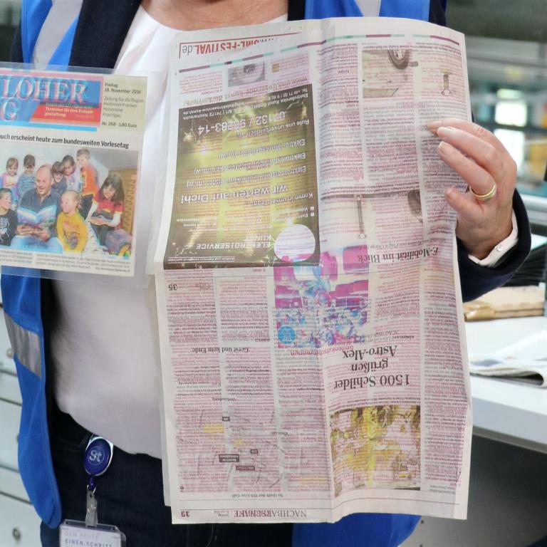 Als letztes kam die Druckmaschine. Sie druckte alles auf die Zeitung. Nun war die Führung vorbei. Bevor wir gingen, wurden im Kinoraum noch ein paar Fragen gestellt. Danach haben wir draußen gesessen, gefrühstückt und sind dann zurück gefahren.