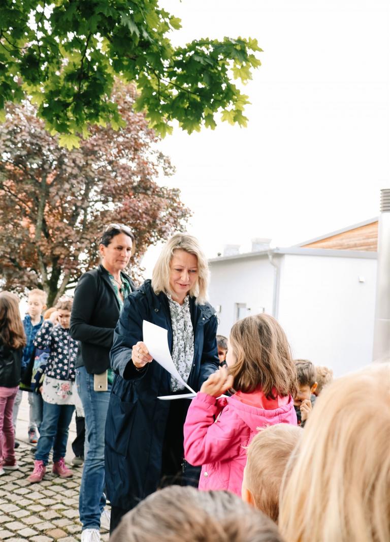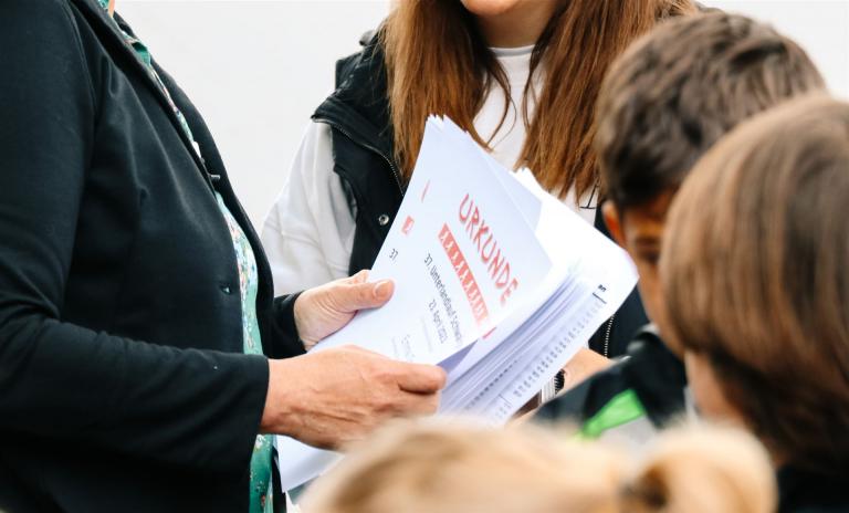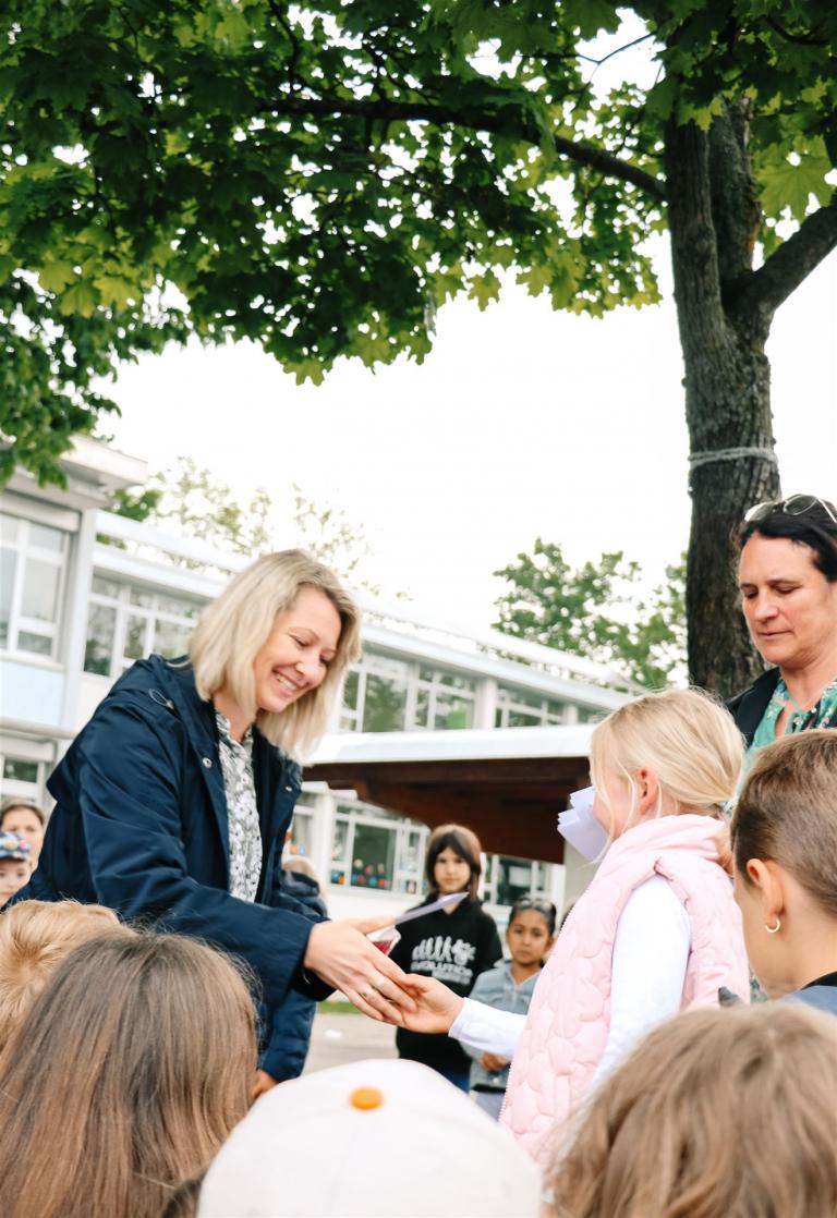 Einige Tage später gab es dann auf dem Schulhof noch die Urkundenübergabe. Sie wurden überreicht von Frau Breddermann. Zusätzlich erhielt jede(r) Läufer*in ein Eis.