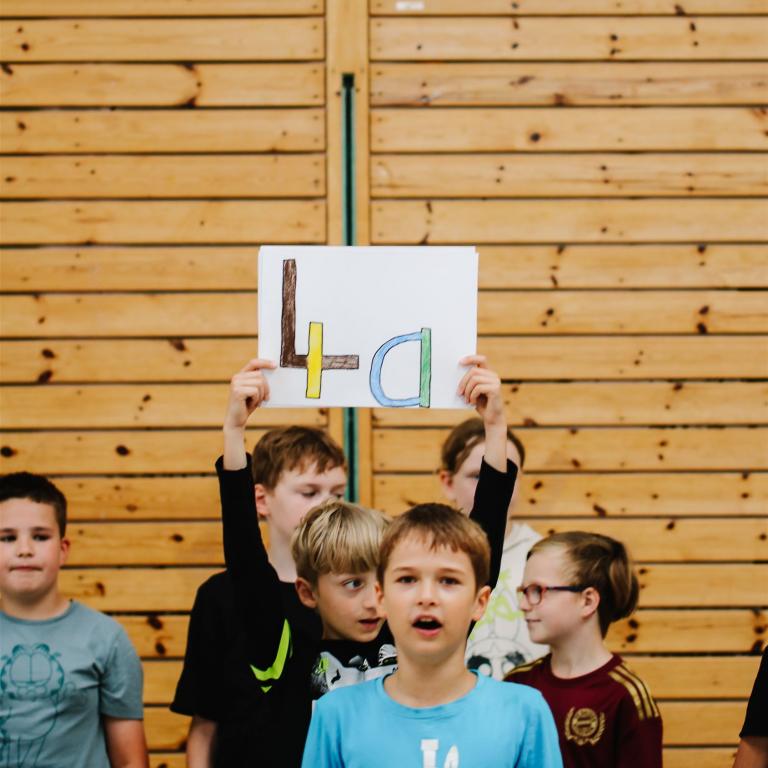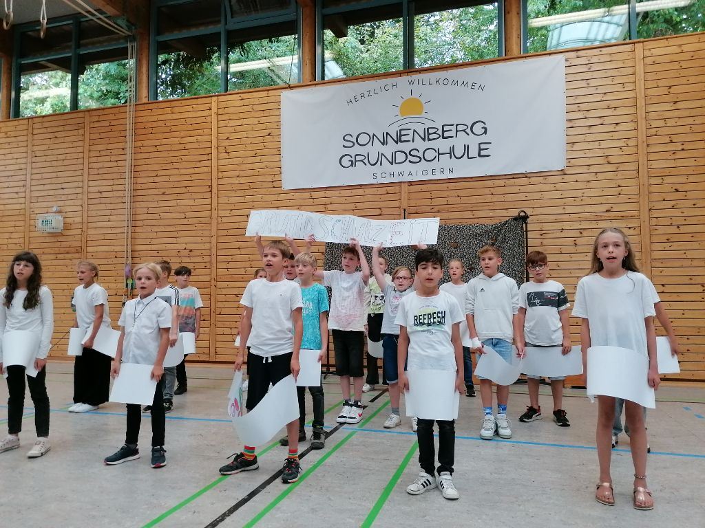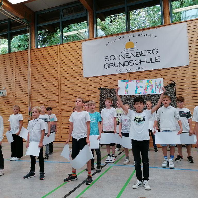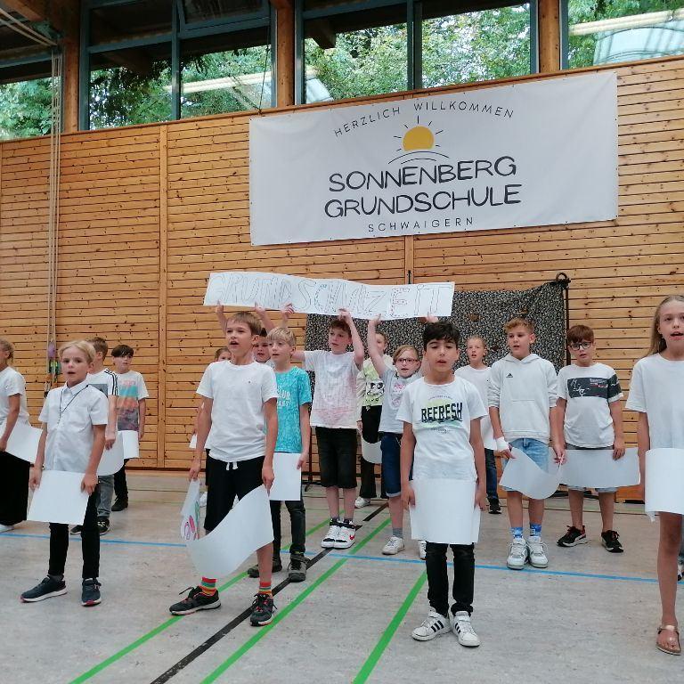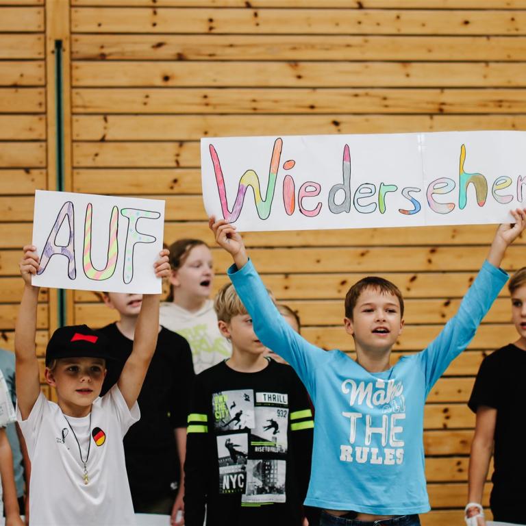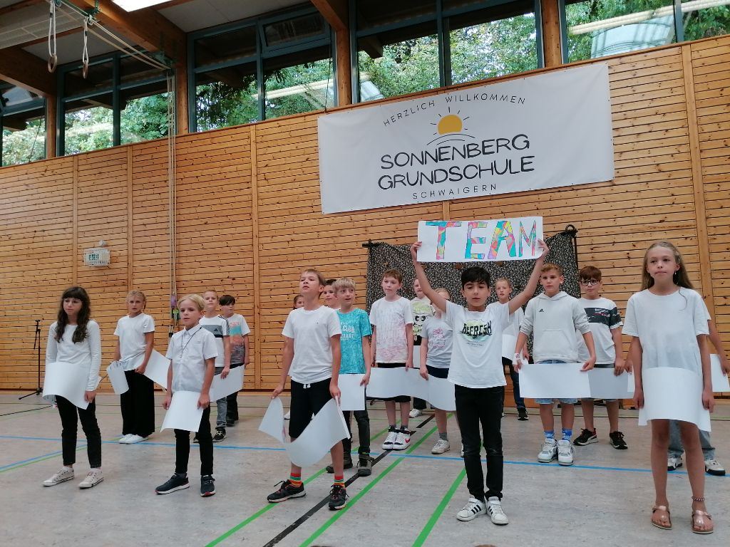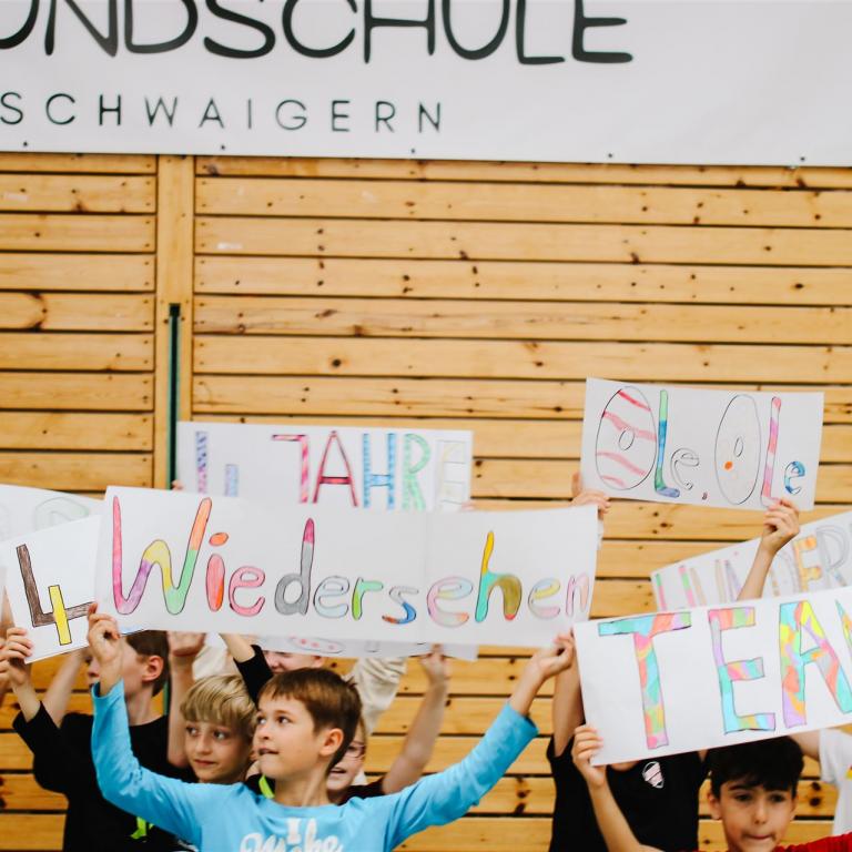 Die 4a sang das Lied "Auf uns" mit abgeändertem Text und begleitet von bunten Schildern, die die wichtigsten Worte aus Lied und der gemeinsamen Zeit beinhalteten: Team - viel erlebt - wunderbar - zusammen - ...
