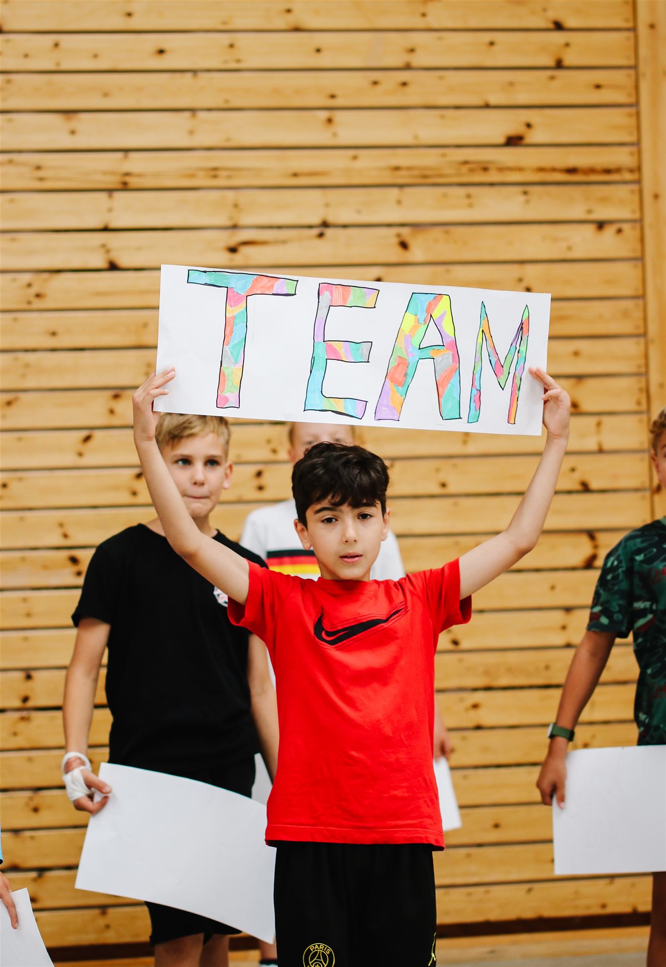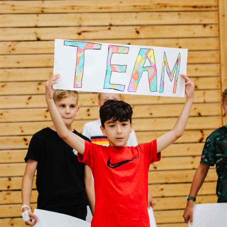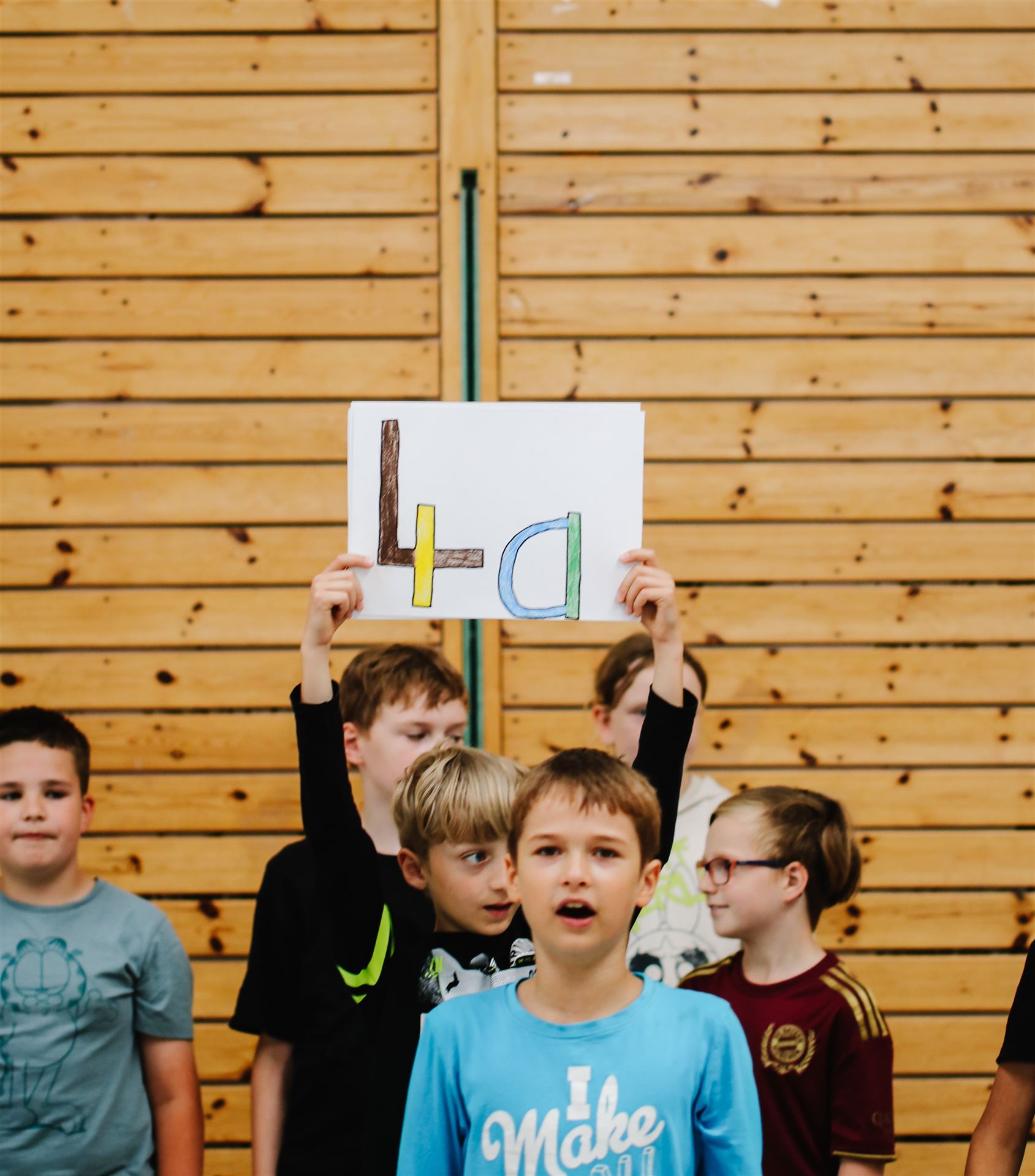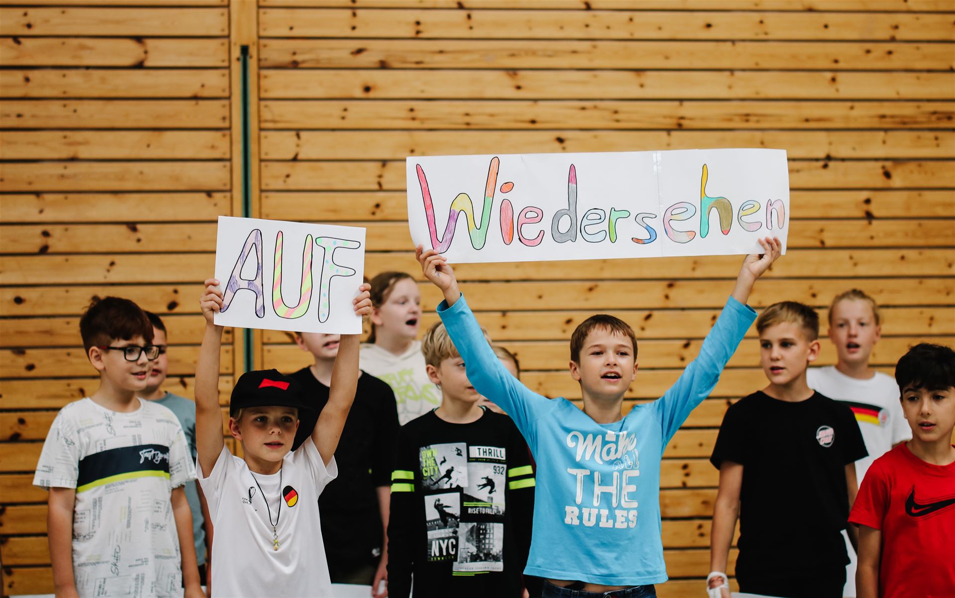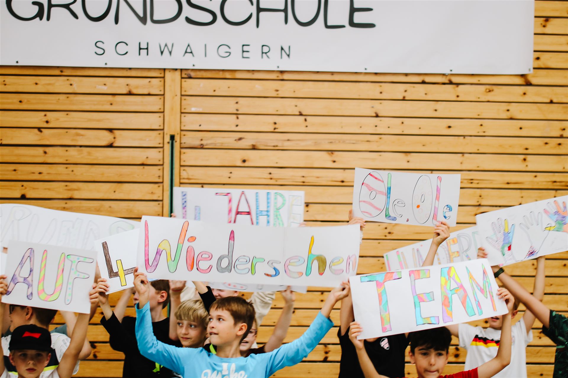 Die 4a sang das Lied "Auf uns" mit abgeändertem Text und begleitet von bunten Schildern, die die wichtigsten Worte aus Lied und der gemeinsamen Zeit beinhalteten: Team - viel erlebt - wunderbar - zusammen - ...